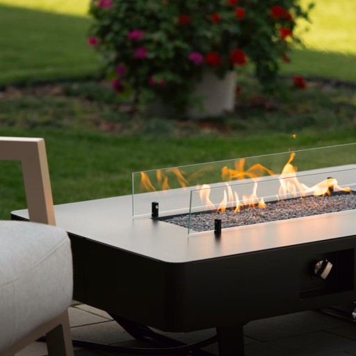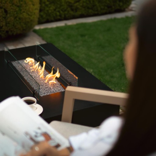 Wykonany z najwyższą jakością Rio Table posiada solidną konstrukcję z odpornej na warunki atmosferyczne stali nierdzewnej pomalowanej na czarno farbą proszkową. Dzięki temu stolik zachwyca niepowtarzalnym wyglądem i zapewnia trwałość na wiele lat. Rio Table odporny jest także na przeciągi i doskonale radzi sobie z silnymi podmuchami wiatru dzięki dwóm ekranom wykonanym ze szkła hartowanego i umieszczonym z obu stron płomienia. Jego nogi zostały umieszczone pod odpowiednim kątem tworząc wrażenie niemal niewidocznych, co dodatkowo poprawia aspekt wizualny. Zjawiskowy ogień, który podkreśla ozdobny granulat, jest zdecydowanie największą zaletą kominka Rio Table, dlatego producent zadbał, aby cała reszta pozostała niezwykle dyskretna i minimalistyczna.