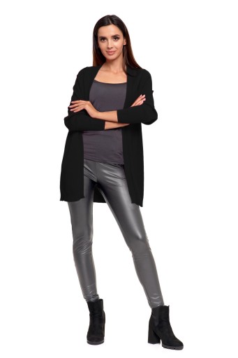 Czarny kolor to klasyka, która pasuje do wielu stylizacji i kształtuje sylwetkę. Długość kardiganu sprawia, że sięga on do uda, co dodaje mu elegancji i sprawia, że jest uniwersalnym elementem garderoby, nadający się zarówno na spotkania towarzyskie, jak i na bardziej casualowe okazje.