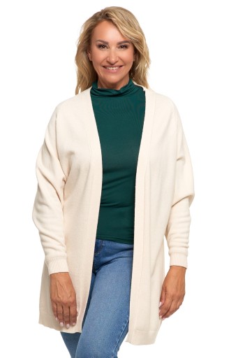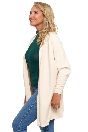 Beżowy kolor to klasyka, która pasuje do wielu stylizacji i kształtuje sylwetkę. Długość kardiganu sprawia, że sięga on do uda, co dodaje mu elegancji i sprawia, że jest uniwersalnym elementem garderoby, nadający się zarówno na spotkania towarzyskie, jak i na bardziej casualowe okazje.