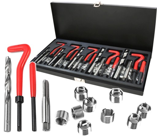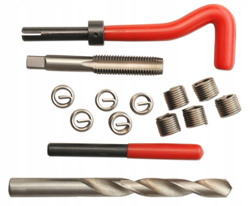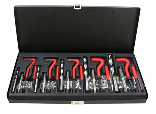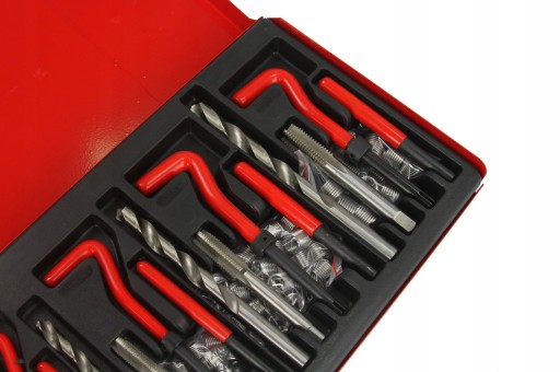 Zestaw do naprawy, regeneracji najbardziej popularnych gwintów. Wszystkie wiertła i gwintowniki wykonano z najlepszej jakości materiałów. Gwintowniki jednostopniowe idealnie nacinają gwint, w który wprowadza się wkładkę spiralną z twardej stali nierdzewnej. Całość w praktycznej walizce.