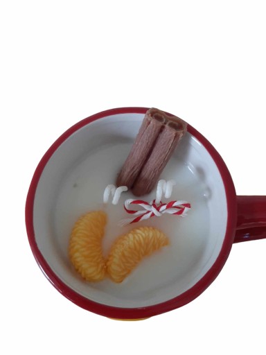Zawartość kubka to naturalny wosk sojowy. Przypomina zimowy napój z cynamonem i mandarynkami. Wszystkie elementy wykonane są z wosku. A tak na marginesie, kiedy wypalisz już swoją świecę, a zajmie Ci to na pewno kilka przyjemnych wieczorów, możesz bez problemu usunąć resztki wosku, umyć kubek ciepłą wodą z płynem i zrobić w nim gorącą czekoladę.