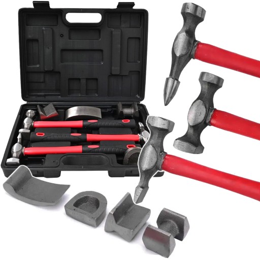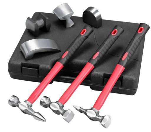 - ✔️ 3 młotki o charakterystycznych płaszczyznach roboczych: standardowy młotek blacharski, młotek z prostym końcem szpiczastym, młotek z okrągłym i kwadratowym końcem