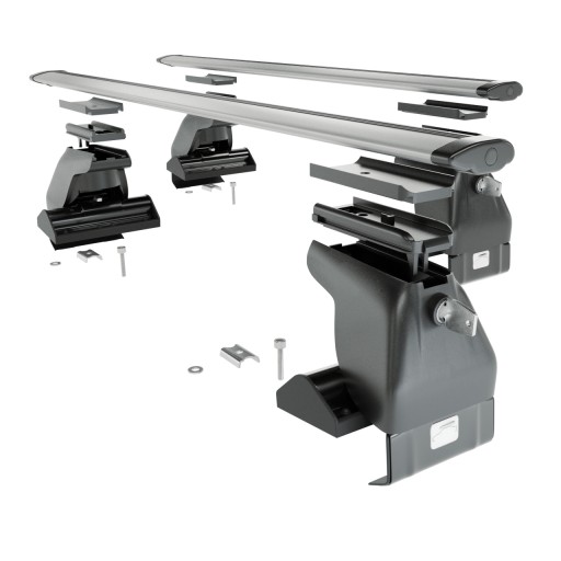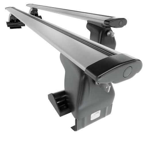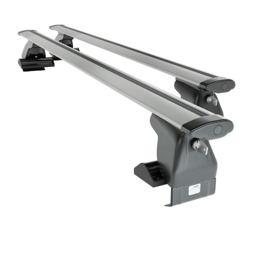 Bagażnik dachowy bazowy składa się z 2 solidnych aluminiowych belek oraz 4 uchwytów (tzw. łap) Dromader D-2, które dopasowane są do typu dachu auta oraz do jego modelu i generacji.