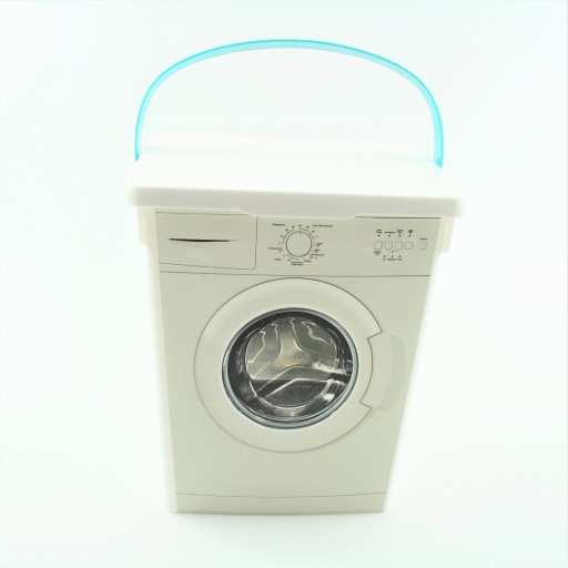 Pojemnik, który wygląda jak miniatura pralki – w jednej strony otwór do ładowania prania z innej rysunek węża do wody!