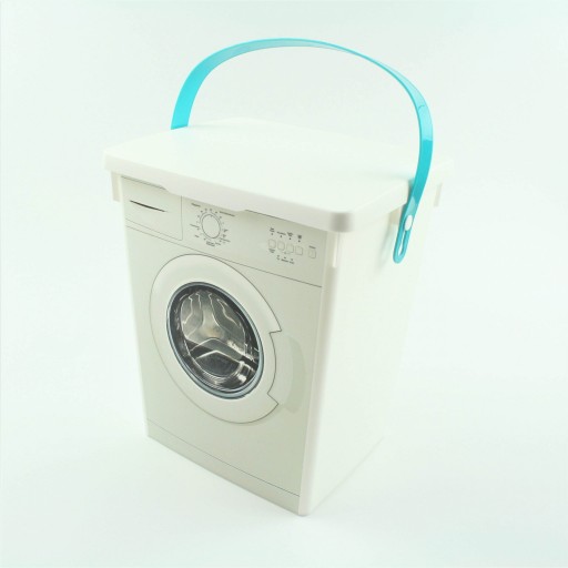 Plastikowy pojemnik, w którym można zamknąć nie tylko proszek do prania, ale może służyć jako pudełko do przechowywania np. ściereczek, gąbek i detergentów potrzebnych do sprzątania.