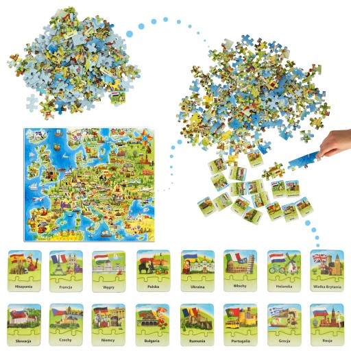 MAPA EUROPY z QUIZEM - 180 el. + 32 el. QUIZ Układanka 180 elementowa przedstawiająca Mapę Europy w dużym efektownym formacie 40 x 46 cm. Dodatkowo zawiera jeszcze 32 kafle edukacyjne z quizem utrwalającym wiedzę. Edukacyjna Mapa Europy to obrazkowa podróż po naszym kontynencie. Układając mapę dziecko dowie się jak wygląda Europa, jakie jest rozmieszczenie poszczególnych krajów i jak wyglądają ich flagi. Zobaczy jak ustuowana jest Polska i z jakimi krajami graniczy. Pozna najbardziej znane obiekty w Europie, niektóre narodowe tradycje, obyczaje i legendy a także wytwarzane produkty. Po ułożeniu dziecko może utrwalić swoją wiedzę rozwiązując quiz polegający na dopasowaniu dwóch kafli z nazwą kraju i flagą. Układanka Mapa Europy - zachęca do pogłębiania swojej wiedzy na temat naszego kontynentu. Stanowi doskonały materiał dydaktyczny w edukacji wczesnoszkolnej oraz wspaniałą zabawę dla dziecka jak i całej 6+Format ułożonego obrazka: 46 x 40 cm