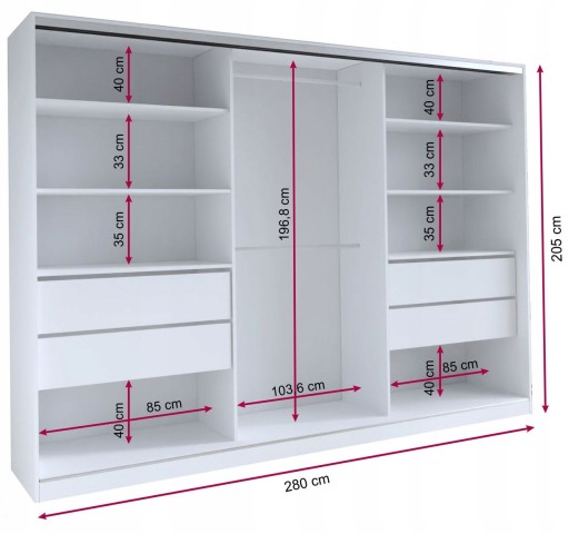- szafa w pełni wyposażona (drążki, szuflady, półki)