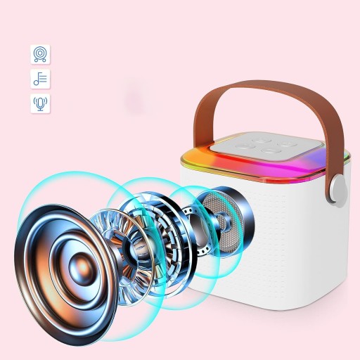 - Diody LED na głośniku karaoke pulsują w rytm muzyki, 360 ° przestrzenny pasek świetlny RGB z pięcioma ustawieniami oświetlenia, aby uwolnić efekty oświetlenia otoczenia RGB. Bezprzewodowa transmisja na odległość do 50 stóp, z różnymi możliwościami regulacji dźwięku.