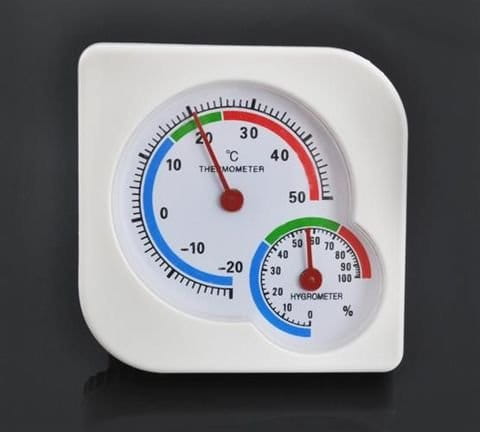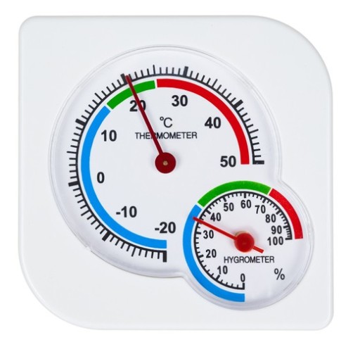 Urządzenie reaguje szybko na zmiany temperatury i wilgotności, a duże, czytelne tarcze i wskazówki, ułatwiają odczyt wartości.