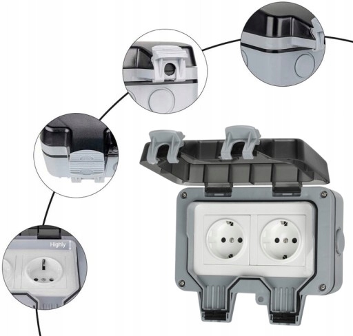 Jest to wodoodporne gniazdo zewnętrzne z ochroną przed deszczem i kurzem.