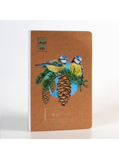 Gustowny notes ekologiczny Green Life. Notatnik z tekturową okładką pochodzącą z recyklingu i okładkową ilustracją sikorek w gnieździe.