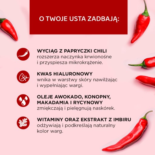 Błyszczyk powiększający usta z papryczka chili to doskonała alternatywa dla inwazyjnego powiększania ust kwasem hialuronowym.