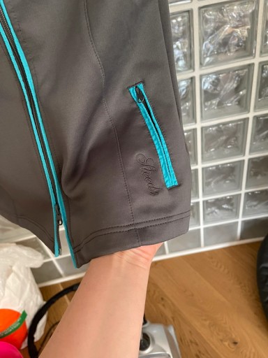 Kamizelka jest w stanie bdb z małym minusem: lekko wypłowiały kolor lamówek przy „rękawkach”. Rozmiar z metki młodzieżowy 176 cm - wpada jak XS/S Kolor szary / antracyt z lamówkami w kolorze turkusowym (ślicznie prezentuje się na żywo). Ma dwie zasuwane kieszenie. Materiał coś a’la softshell Wymiary: szerokość pod pachami: 43 dł. całkowita: 57