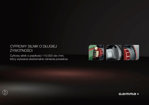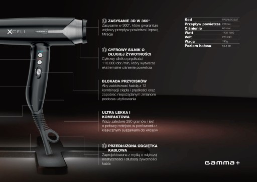 Suszarka do włosów Gamma+ Xcell to ultra lekkie urządzenie, wyposażone w cyfrowy silnik i technologię jonową.