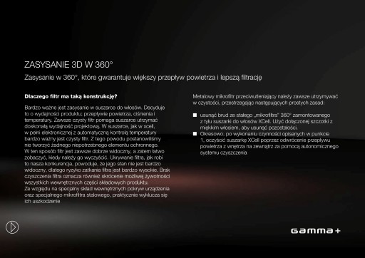 Suszarka Gamma+ Xcell, zasysa powietrze w 360°, co zapewnia lepszą filtrację i większy przepływ powietrza.