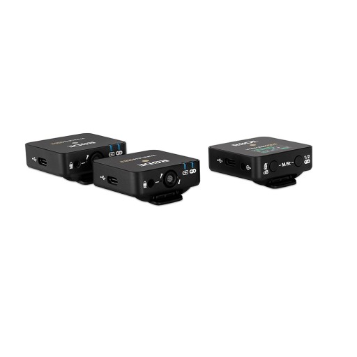 2-kanałowy cyfrowy system bezprzewodowy, transmisja 2.4GHz, zasięg 200m, 1 nadajnik [wbudowany mikrofon i wejście mikrofonowe], odbiornik [pamięć wewnętrzna 24h nagrywania], wyjścia TRS 3.5mm, USB-C, iOS, zasilanie [bateria Li-Ion, USB], czas pracy 7h