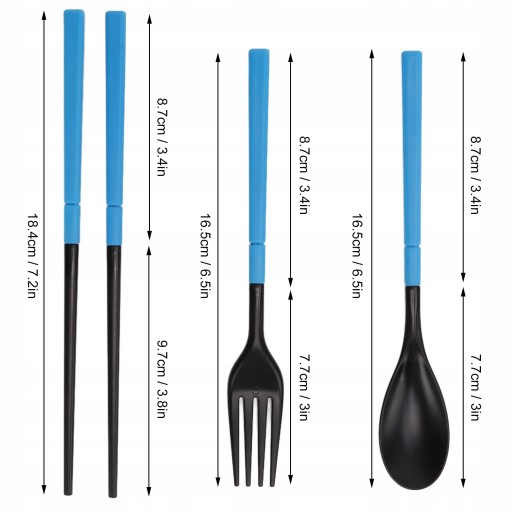 Specyfikacja: po połączeniu całkowita długość pałeczek wynosi około. 18,4 cm/7,2 cala, całkowita długość widelca wynosi około. 16,5 cm/6,5 cala, a całkowita długość łyżki wynosi około. 16,5 cm / 6,5 cala