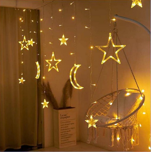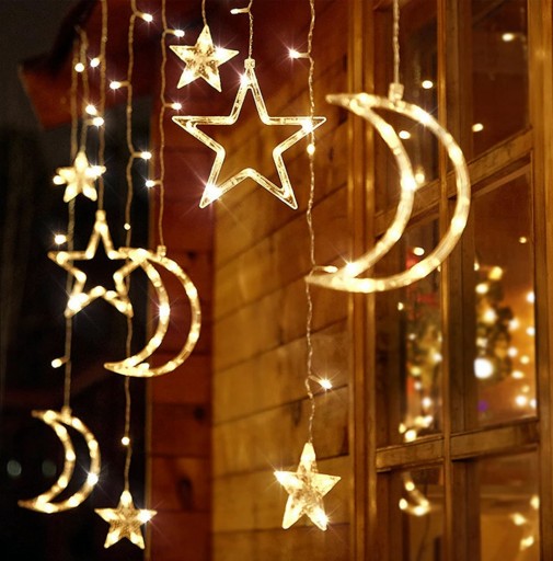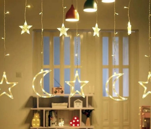 Girlanda składająca się z księżyców i gwiazdek to świetny pomysł na dekorację pokoju dziecka. Świecącej kurtyna może spełniać rolę lampki nocnej lub dodatkowego oświetlenia dekoracyjnego.