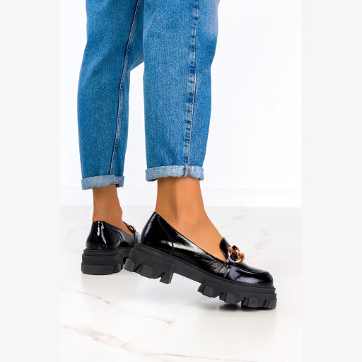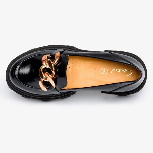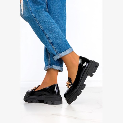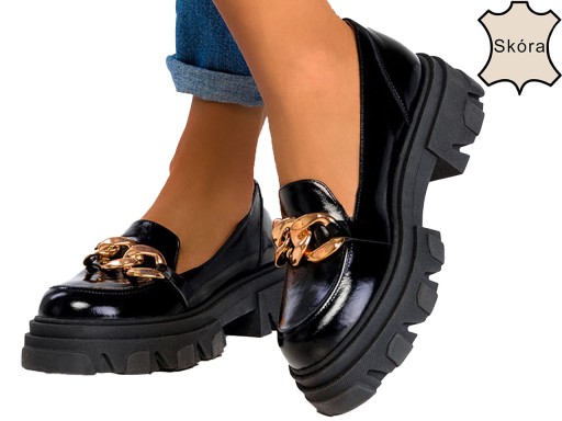 Czarne mokasyny na platformie półbuty ze złotym łańcuchem polska skóra Casu 08251/272/00/00/002