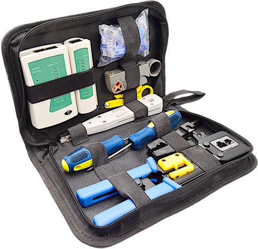 Kompletny zestaw - w zestawie znajduje się tester kabli, zaciskarka, wciskacz, wtyki RJ 45, stripper, śrubokręt płaski i krzyżak oraz narzędzia do cięcia kabli. Całość pozwala na usunięcie wszelakich usterek i jest niezbędnikiem każdego instalatora sieci.