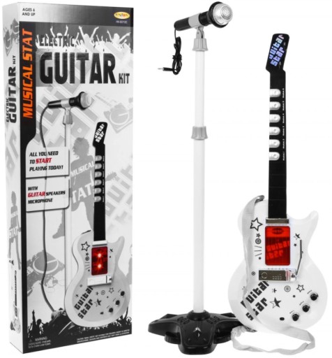 Niepowtarzalna gitara elektryczna dla przyszłego gitarzysty wraz z mikrofonem w zestawie.