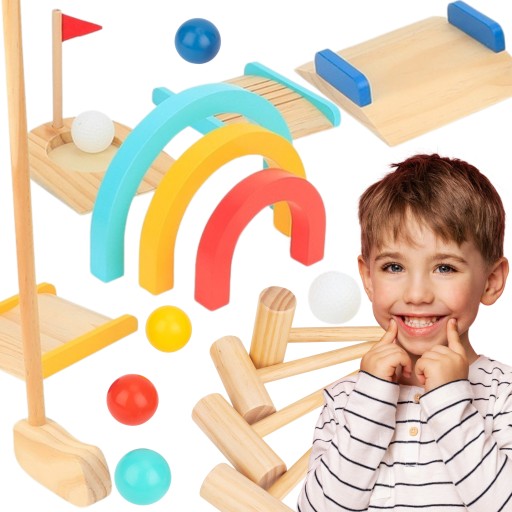 - zestaw posiada: 2 kijki, jeden dołek, chorągiewka, 2 piłki, przeszkody, tunele,