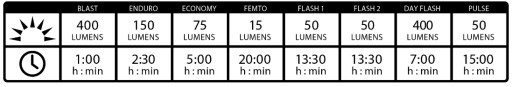 - Lampka może pracować maksymalnie 20 godzin w trybie Femto 15 lm, przy maksymalnej mocy (blast) 400 lm akumulator pozwoli na pracę przez godzinę.