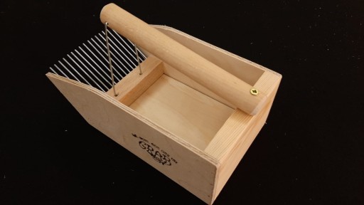 Wykonana z drewna oraz sklejki,zbijana na kleju,bardzo wytrzymała,lekka i poręczna,zaprojektowana tak żeby zawartość nie wysypywała się podczas zbierania.