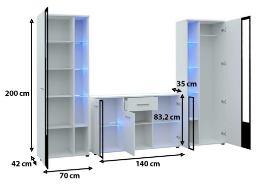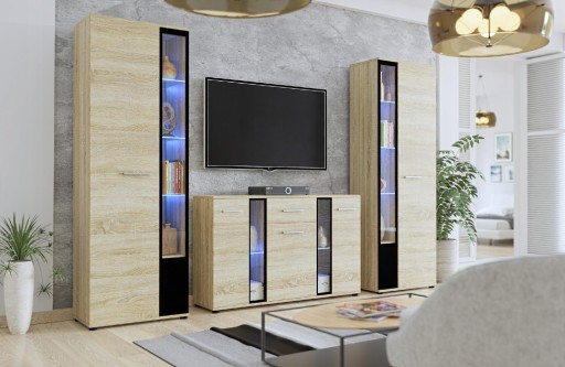 Nowoczesna meblościanka składająca się z dwóch wysokich witryn oraz komody o szerokości 140 cm z szufladą. Jedna z witryn wyposażona została w drążek na wieszaki i półki z możliwością podświetlenia, a druga w cztery półki z płyty wiórowej oraz szklane półki, które również można podświetlić oświetleniem led. Zestaw wkomponuje się doskonale w każde z wnętrz salonu. Meble wykonywane są z płyty dwustronnie laminowanej o grubości 16 mm, charakteryzującej się dużą wytrzymałością na uszkodzenia mechaniczne.