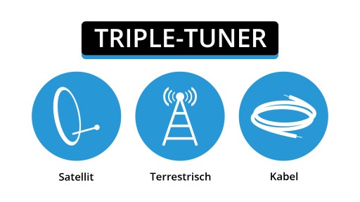 Z Triple-Tunerem jesteś przygotowany na każdą sytuację. Niezależnie od tego, czy chodzi o telewizję satelitarną, telewizję naziemną za pomocą anteny DVB-T, czy też odbiór kablowy za pośrednictwem przyłącza domowego - multi-tuner jest gotowy na każdy rodzaj odbioru.