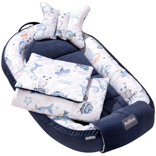 Cały zestaw uszyty jest ręcznie z dwóch rodzajów materiałów, przyjaznych dla delikatnej skóry maluszka. Z jednej strony to miękki velvet, z drugiej delikatna i miękka bawełna w przepiękne morskie zwierzątka. Dolna część gniazdka została przedłużona o owijkę. Po zapięciu klamry spinającej i utrzymującej stopień otulenia, w prosty i łatwy sposób założysz ozdobną owijkę na ten element kokonu.