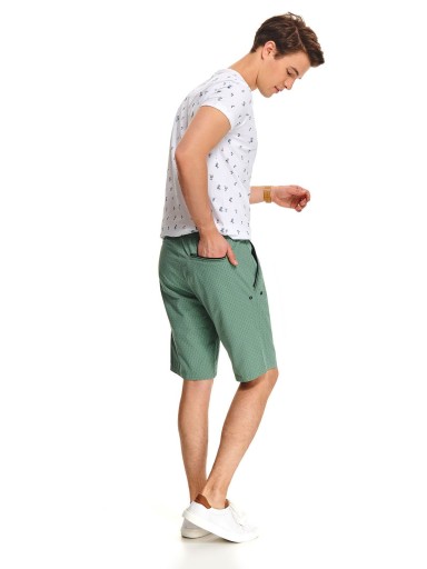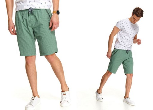 Niezwykle ciekawie zaprojektowane szorty męskie w delikatne wzroki na całości. Wykonane są z bardzo przyjemnej w dotyku bawełny, posiadają gumkę i wiązanie z przodu na sznurek. Dla wygody użytkowania szorty posiadają kieszenie po bokach, jak i jedną kieszeń z tyłu. Są one przyozdobione delikatnymi guzikami w okolicach dołu kieszeni. Świetnie sprawdzą się jako element stroju wakacyjnego. Szorty dostępne w kolorze zielonym.