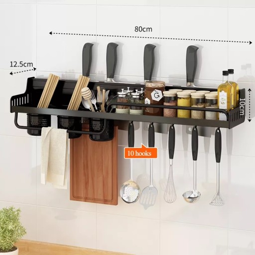 Bardzo funkcjonalny i stylowa półka, która spełnia rolę organizera. Posiada zdejmowane haczyki na których powiesisz deskę do krojenia, łyżki czy chochle lub inne przybory. Są otwory na noże lub nożyczki, kubki na sztućce, pałeczki i inne przybory. Wyposażona jest w gładką półkę na której postawisz przyprawy, olej. Jest wyposażona w reling oby powiesić ściereczkę.