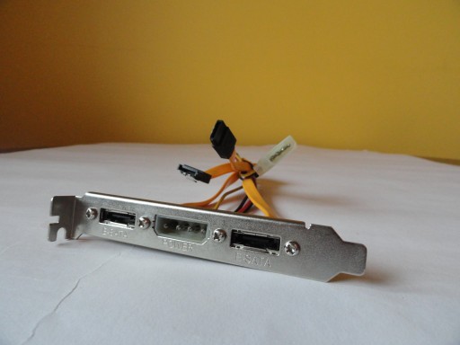Sprzedam używany adapter (śledź) z dwoma gniazdami eSATA oraz jednym zasilającym 4-pin do dysków twardych lub napędów optycznych.