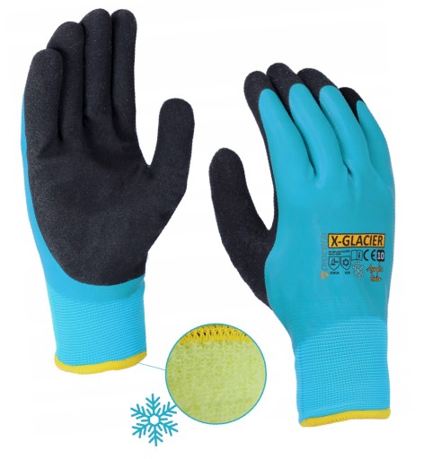 Profesjonalne rękawice X-GLACIER wykonane z wysokiej jakości przędzy akrylowej, powlekane gładkim lateksem(kolor niebieski), z dodatkowym powleczeniem lateksem SANDY w części chwytnej. Zapewniają doskonałą przyczepność nawet w trudnych warunkach.