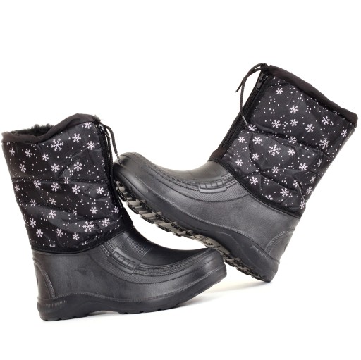 Damskie, zimowe śniegowce w kolorze czarnym lub granatowym ( kolor wybierany losowo ) . Posiadają ocieplenie w postaci ciepłej pianki. Zapięcie na zamek umożliwia łatwe zakładanie. Posiadają wodoodporną, solidną, grubą piankową podeszwę izolującą od zimna. �