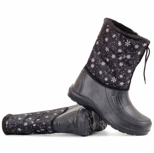 Damskie, zimowe śniegowce w kolorze czarnym lub granatowym ( kolor wybierany losowo ) . Posiadają ocieplenie w postaci ciepłej pianki. Zapięcie na zamek umożliwia łatwe zakładanie. Posiadają wodoodporną, solidną, grubą piankową podeszwę izolującą od zimna. �