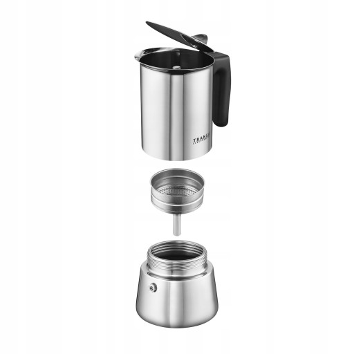 Kawiarka do zaparzania kawy Caffè 12 Tz Transa Electronics® nazywana również moka pot to niewielkie urządzenie, służące do przygotowania kawy metodą zaparzenia. Składa się z trzech głównych elementów: dolnej części, górnej części z lejkiem i sitkiem oraz pokrywki.