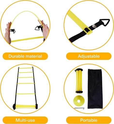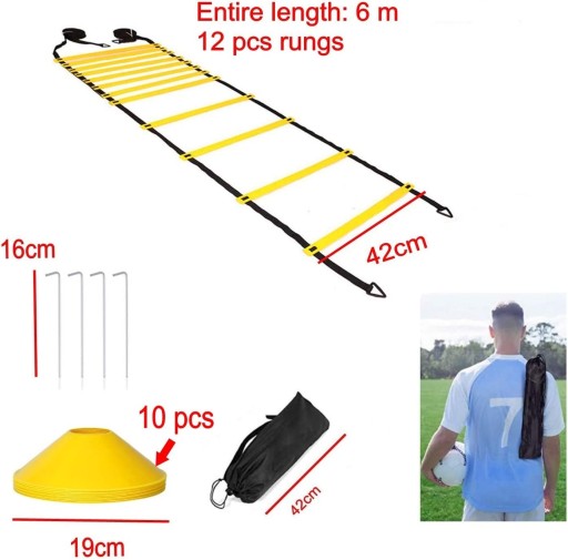 Zestaw drabinek treningowych jest wyposażony w 10 trwałych stożków z tworzywa sztucznego, które mogą być używane do oznaczania obszarów treningowych, rozgrzewania i ćwiczeń na podstawie progów. W zestawie znajduje się również 12 plastikowych szczebli, które są doskonałej jakości i trwałe do treningu i ćwiczeń.
