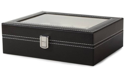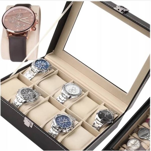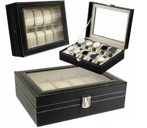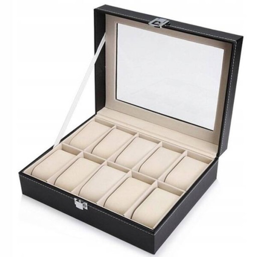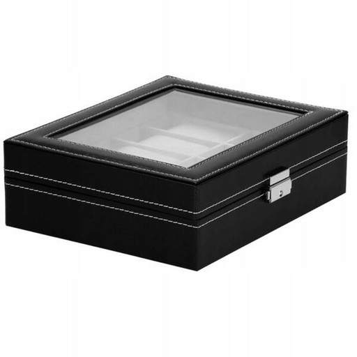 Eleganckie i praktyczne etui na zegarki. Pomieści 10 szt. Twoich ulubionych zegarków. Wykonane z czarnej ekoskóry, natomiast środek jest wyłożony kremowym, mięciutkim materiałem. Etui posiada szklane okienko oraz metalowy zamek. Każdy zegarek będzie pięknie wyeksponowany i łatwo dostępny. W szkatułce można przechowywać nie tylko zegarki ale bransoletki oraz inna biżuterię, wystarczy wyjąć poduszeczki. WYMIARY: