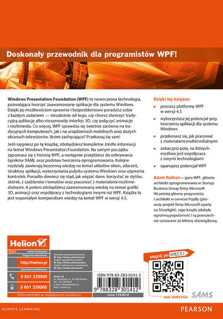 Windows Presentation Foundation (WPF) to nowoczesna technologia, pozwalająca tworzyć zaawansowane aplikacje dla systemu Windows. Dzięki jej możliwościom sprawnie i bezproblemowo poradzisz sobie z każdym zadaniem -- niezależnie od tego, czy chcesz stworzyć tradycyjną aplikację albo niesamowity interfejs 3D, czy połączyć animacje i multimedia. Co więcej, WPF sprawdza się świetnie zarówno na tradycyjnych komputerach, jak i na urządzeniach mobilnych oraz dużych ekranach telewizorów. Brzmi zachęcająco? Przekonaj się sam!Jeśli sięgniesz po tę książkę, zdobędziesz kompletne źródło informacji na temat Windows Presentation Foundation. Na samym początku zapoznasz się z historią WPF, a następnie przejdziesz do odkrywania tajników XAML oraz podstaw tworzenia oprogramowania. Kolejne rozdziały zawierają bezcenną wiedzę na temat układów okien, zdarzeń, struktury aplikacji, wykorzystania pulpitu systemu Windows oraz korzystania z kontrolek. Ponadto dowiesz się stąd, jak wiązać dane, korzystać ze stylów, szablonów, skórek i tematów oraz pracować z materiałami multimedialnymi. A potem zdobędziesz zaawansowaną wiedzę na temat grafiki 3D, animacji oraz współpracy z technologiami innymi niż WPF. Książka ta jest wspaniałym kompendium wiedzy na temat WPF w wersji 4.5Dzięki tej książce: