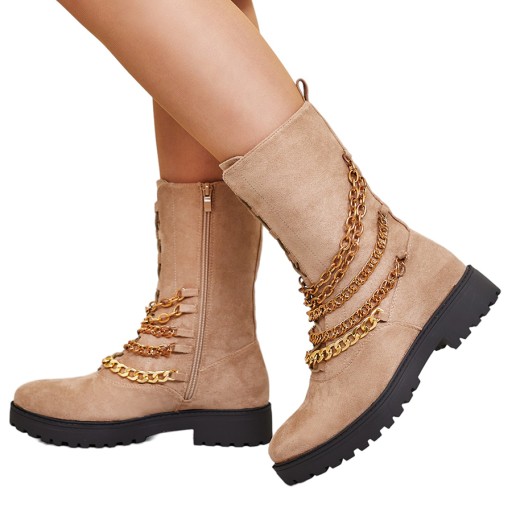 Botki damskie typu workery na masywnej podeszwie. Cholewka ze skóry ekologicznej zamszowej, zdobiona łańcuszkami, a w środku ocieplane futerkiem. Model sznurowany i zapinany po boku na suwak. Świetny wybór na chłodniejsze dni!
