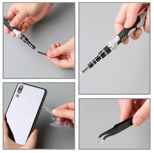 Zestaw pincet, otwieraków, klucza i przyssawki jest niezbędny do prac przy smartfonach jak wymiana wyświetlacza czy baterii. Pamiętaj aby zawsze postępować zgodnie z instrukcją producenta danego urządzenia.