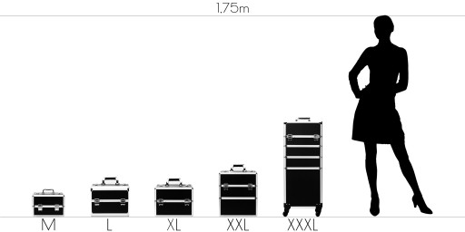 Kuferek otwierany dwustronnie posiada 2 rozsuwane półki na drobne przybory, jak lakiery hybrydowe, pędzle, kosmetyki niewielkich gabarytów i sporych rozmiarów.