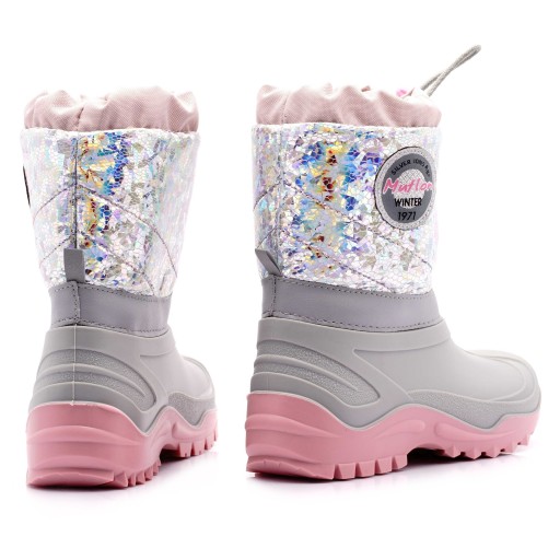 Bardzo ciepłe śniegowce dla dzieci, polskiej firmy MUFLON. Wykonane są z wysokiej jakości materiałów. Górna część cholewki zrobiona jest z ortalionu (zaimpregnowany materiał tekstylny), odporny na przemoczenie ze ściąganym kołnierzem zabezpieczającym przed dostawaniem się wody i śniegu do środka. Buty są ocieplone od wewnątrz naturalną 100 % wełną. Posiadają ocieploną wkładką z folii aluminiowej perforowanej, otoczonej od góry i dołu włókniną, dzięki czemu zachowuje doskonałe właściwości termoizolacyjne.