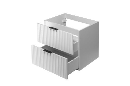 Stworzona w nowoczesnym i stylowym designie, ta kolekcja wyróżnia się modnymi, ryflowanymi frontami, wykonanymi z wysokiej jakości płyty MDF. Korpus mebli z płyty laminowanej gwarantuje trwałość i odporność na warunki łazienkowe.