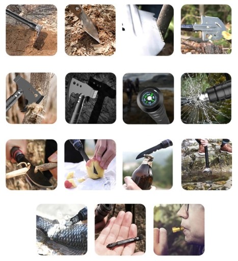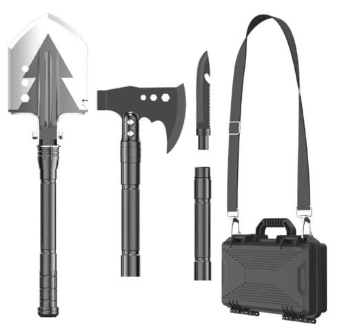 Zestaw survivalowy w walizce to doskonałe akcesorium każdego miłośnika plenerowych wypraw. Konstrukcja składanej rękojeści pozwala na wygodne użytkowanie dołączonych narzędzi i akcesoriów, w tym wielofunkcyjnej saperki, toporka, noża, kompasu, zbijaka do szyb oraz śrubokrętu. Rękojeść składa się z 3 elementów, które możemy dowolnie łączyć ze sobą oraz dobrać jej optymalną długość do naszych potrzeb.