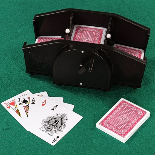 - 1x mechaniczny tasownik kart (sterowanie korbą ręczną - bez baterii), 1x krupier, 1x podkładka do gry, 1x big blind, small blind i przycisk rozdającego, 5x kości kasynowe: 17 mm (długość boku).