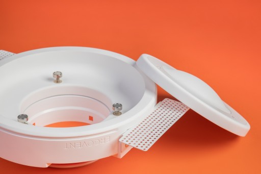 Anemostat RONDO-160 wyposażony jest w mocne uchwyty magnetyczne ze stali nierdzewnej, które gwarantują pewne i trwałe zamocowanie. Estetyczna rama gipsowa i specjalna krawędź umożliwiają z łatwością nałożenie szpachli, co zapewnia harmonijne przejście między anemostatem a otaczającą go powierzchnią.