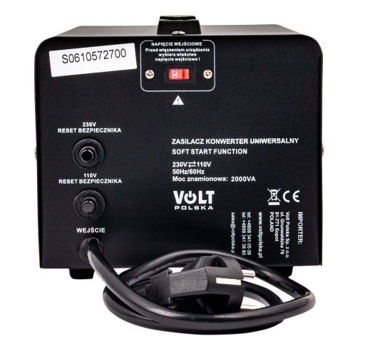Uniwersalny konwerter napięcia VP 2000 230/110V służy do obniżania napięcia zmiennego AC-230V do napięcia zmiennego AC-110V lub do podwyższania napięcia zmiennego AC-110V do napięcia zmiennego AC-230V.